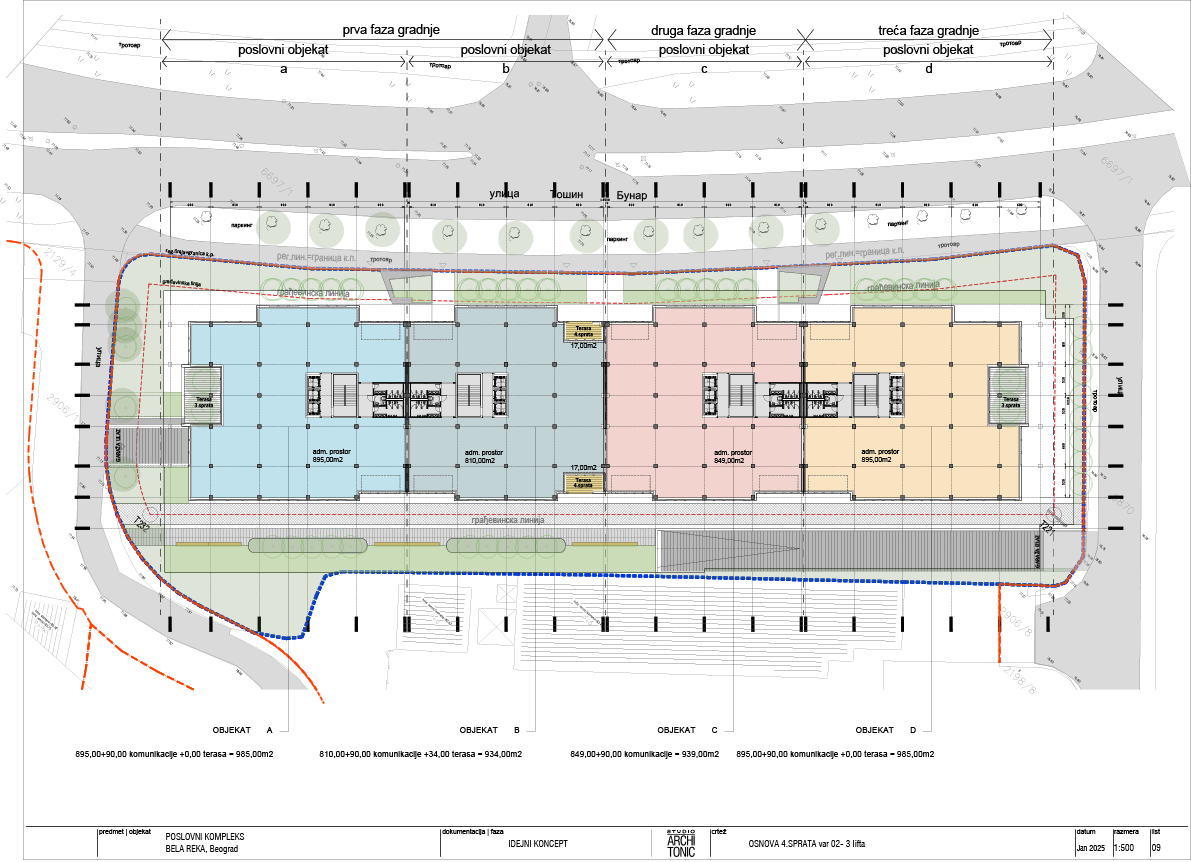 Layout of the Fourth Floor Total area: 4303,00m² Building A, Phase 1 – 1134,00m² Building B, Phase 1 – 1017,50m²Building C, Phase 1 – 1017,50m²Building D, Phase 2 – 1134,00m²