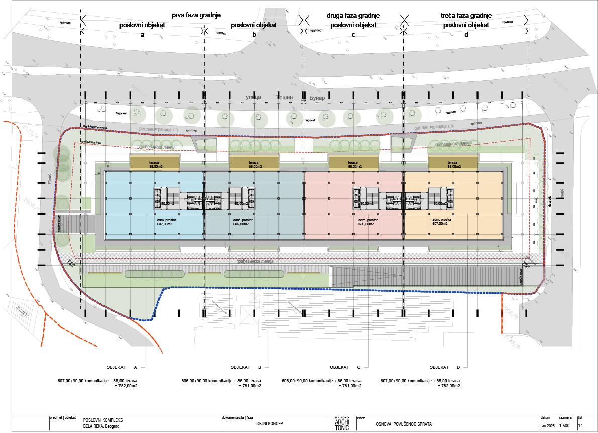 Планировка отступающего этажа Общая площадь 4000,00m² Здание A, первая фаза — 1030,00m² Здание B, первая фаза — 970,00m²Здание C, первая фаза — 970,00m²Здание D, вторая фаза — 1030,00m²