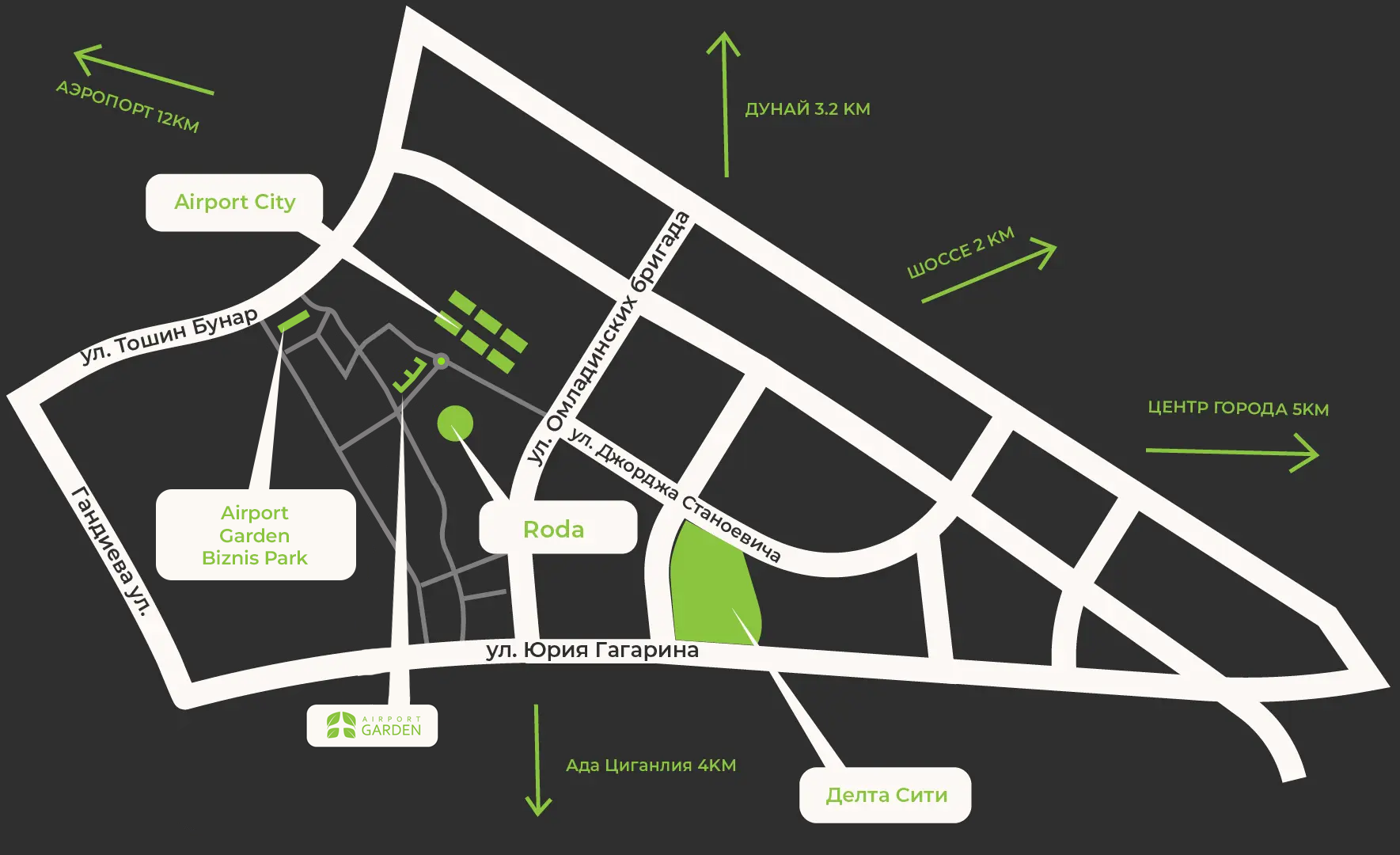 Для тех, кто часто путешествует, международный аэропорт «Никола Тесла» находится всего в 12 километрах, что обеспечивает быстрый и эффективный доступ к глобальным рынкам. Кроме того, центр города Белграда находится всего в 5 километрах, что позволяет легко и быстро добраться до всех важных государственных и бизнес-институтов.